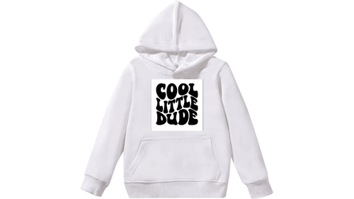 Fresh style for the trendiest little dudes! This optic white pullover hoodie features the signature "Cool Little Dude" graphic in its bold, retro wavy typography. The high-contrast black-on-white design offers a modern, minimalist look that makes a big statement whether at school or on the weekend.