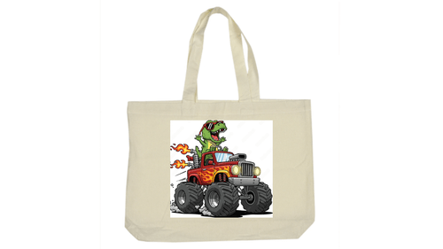 Dinosaur Monster Truck Canvas Tote Bag – "Dino-Drive" Graphic – Natural Cream