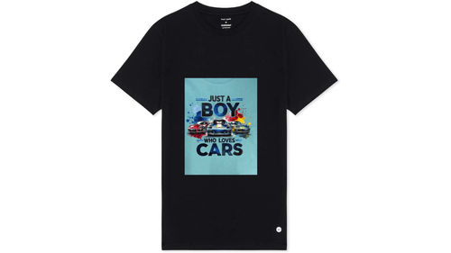 Start your engines! This bold black T-shirt is designed for the kid who lives for speed, sleek designs, and the roar of an engine. Featuring the phrase "Just a Boy Who Loves Cars" set against a dynamic, splash-style background, the graphic showcases three high-performance supercars in brilliant blues and yellows.